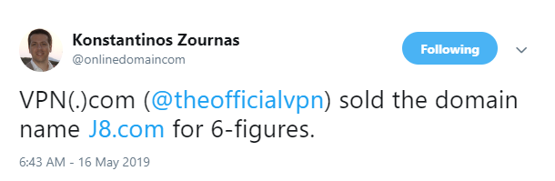 據了解,國外域名經紀公司VPN.com促成了J8.com的交易,價格為六位數美金,但具體多少卻沒有公開,不過參照以往2雜.com域名成交的價格來判斷,J8.com應該在大六位數至小七位數人民幣區間。